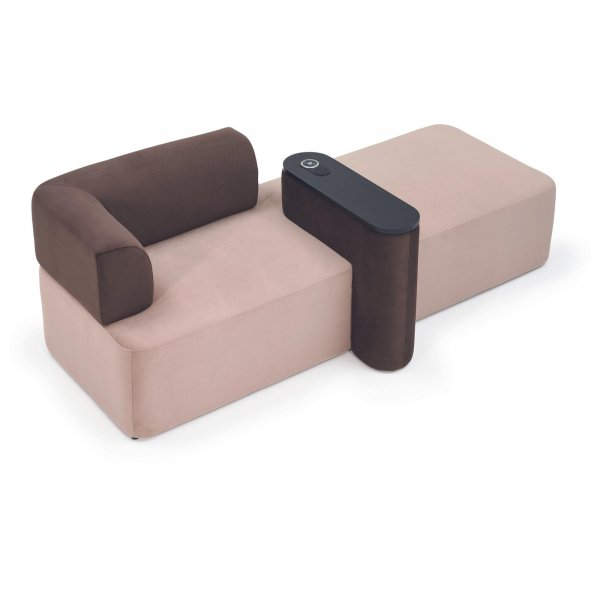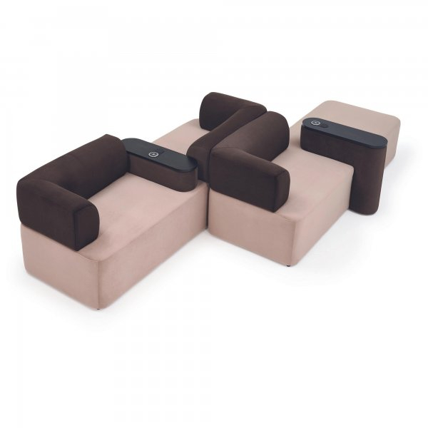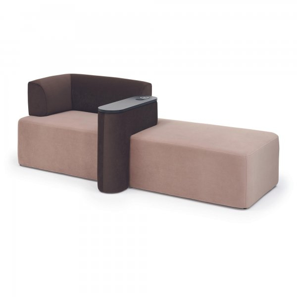 Canapea modulara destinata zonelor de asteptare, lobby-urilor si spatiilor comerciale, proiectata pentru a imbina confortul cu functionalitatea moderna. Structura sa volumetrica si liniile rotunjite asigura o pozitie relaxanta, iar bratul lateral tapitat ofera sustinere suplimentara. Elementul central este o masuta integrata, prevazuta cu suprafata dura si incarcator wireless pentru diferite dispozitive, ideala pentru utilizare intensiva in medii publice.