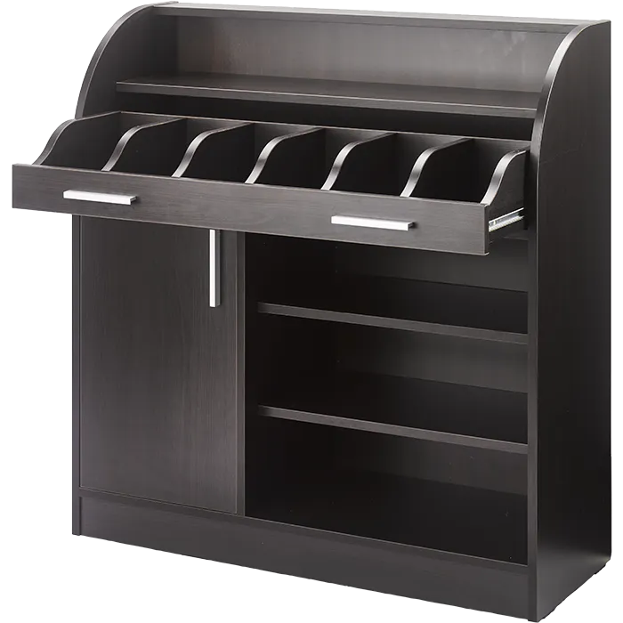Partea superioara este prevazuta cu un compartiment deschis cu separatoare, ideal pentru meniuri, note de plata, pliante sau alte materiale necesare in timpul servirii. Sub acesta se regaseste un spatiu deschis, util pentru depozitarea rapida a tavilor, farfuriilor sau accesoriilor frecvent utilizate.