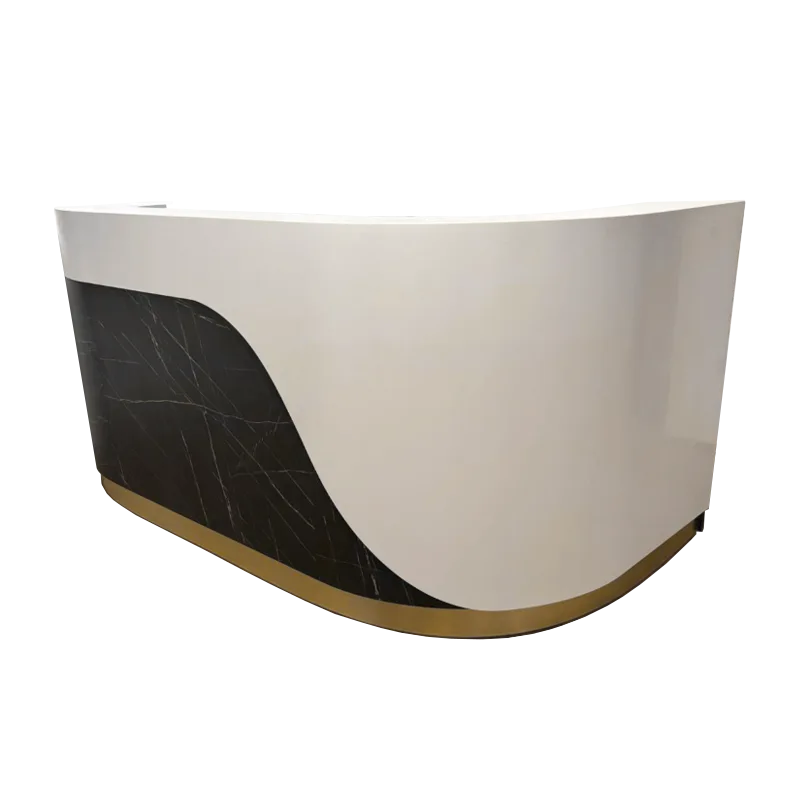 Modelul CRATE este o recepție modernă, concepută pentru spații profesionale precum clinici, cabinete stomatologice, saloane de înfrumusețare sau magazine. Designul său curbat și elegant se remarcă prin armonia dintre suprafețele lucioase și accentele mate, creând o estetică sofisticată și primitoare. Linia fluidă a blatului superior alb contrastează subtil cu panoul frontal în finisaj de marmură neagră, iar soclul auriu oferă o notă de rafinament contemporan.