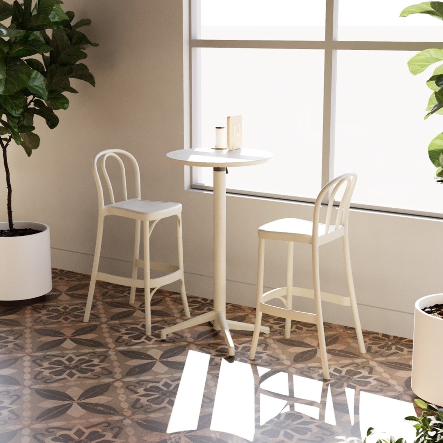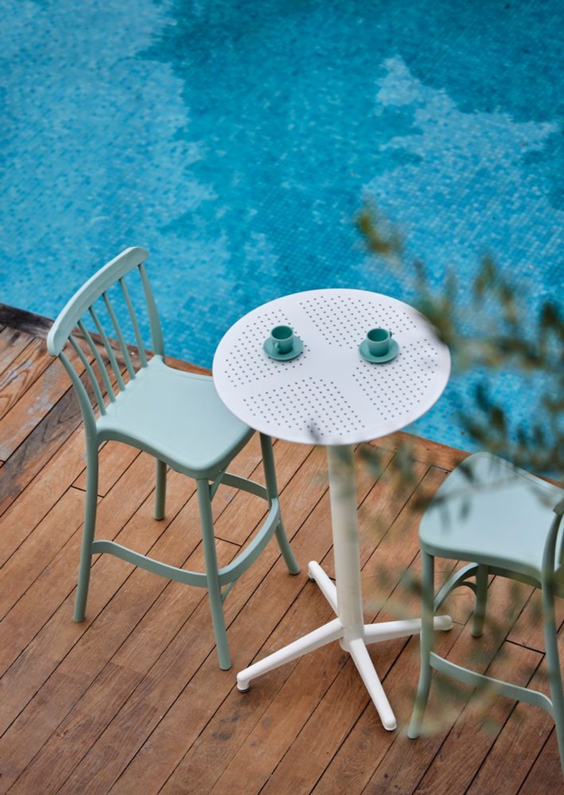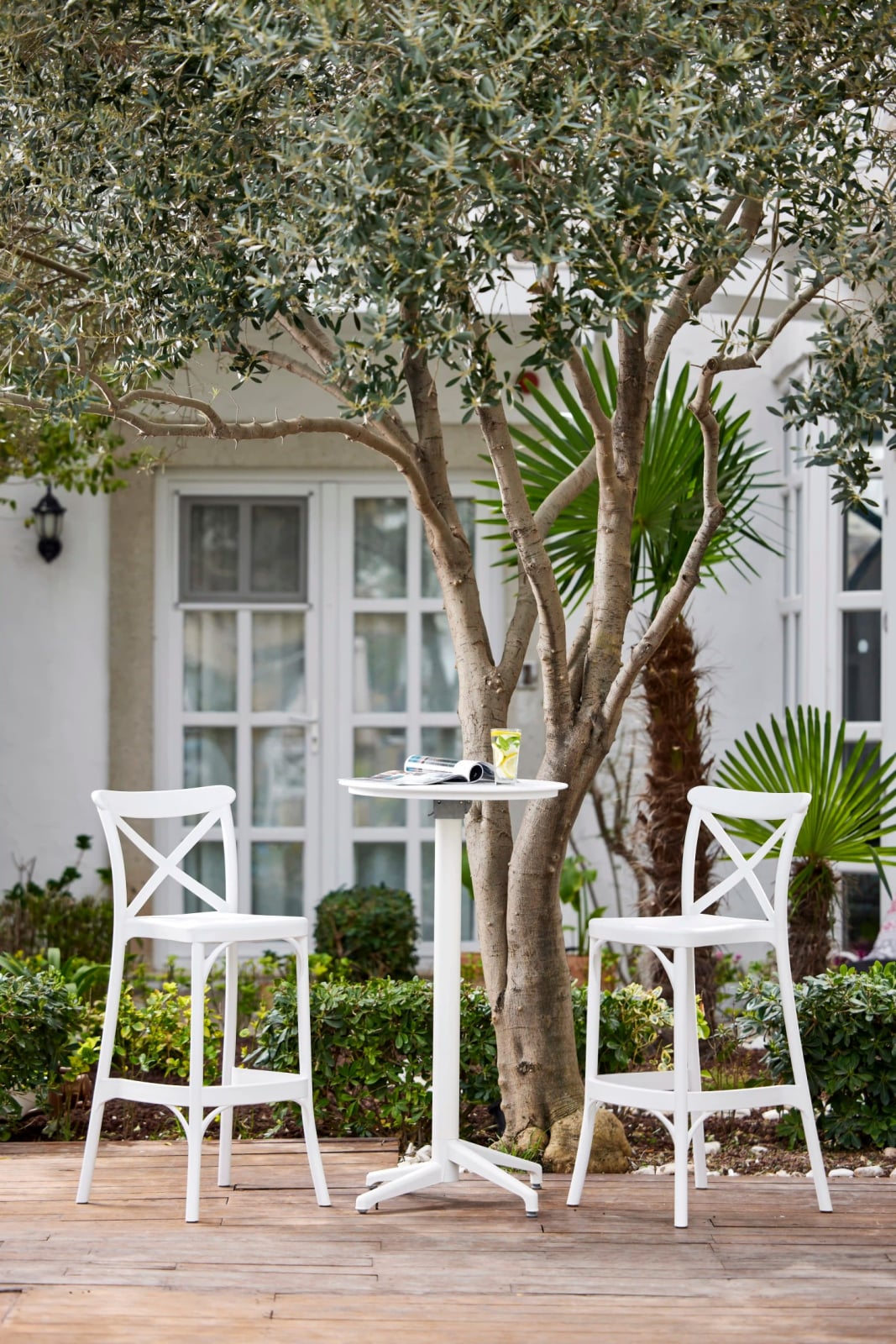 Masa inalta de bar pentru terasa cu blat rotund rabatabil MOON BAR, este o masa cu o silueta eleganta si un design minimalist. Piciorul mesei este realizat din aluminiu extrudat, ceea ce o recomanda a fi utilizata la exterior. Blatul este realizat din plastic si are o forma rotunda cu dimensiunea de 60 cm.