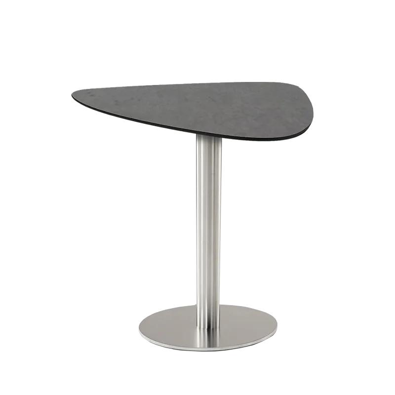 Structura cu picior central și bază din inox conferă stabilitate ridicată și un aspect profesional, fiind ușor de întreținut și rezistentă la uzură. Contrastul dintre blatul închis la culoare și finisajul metalic al piciorului adaugă un plus de eleganță, potrivit pentru interioare moderne, urbane sau cu influențe industriale.