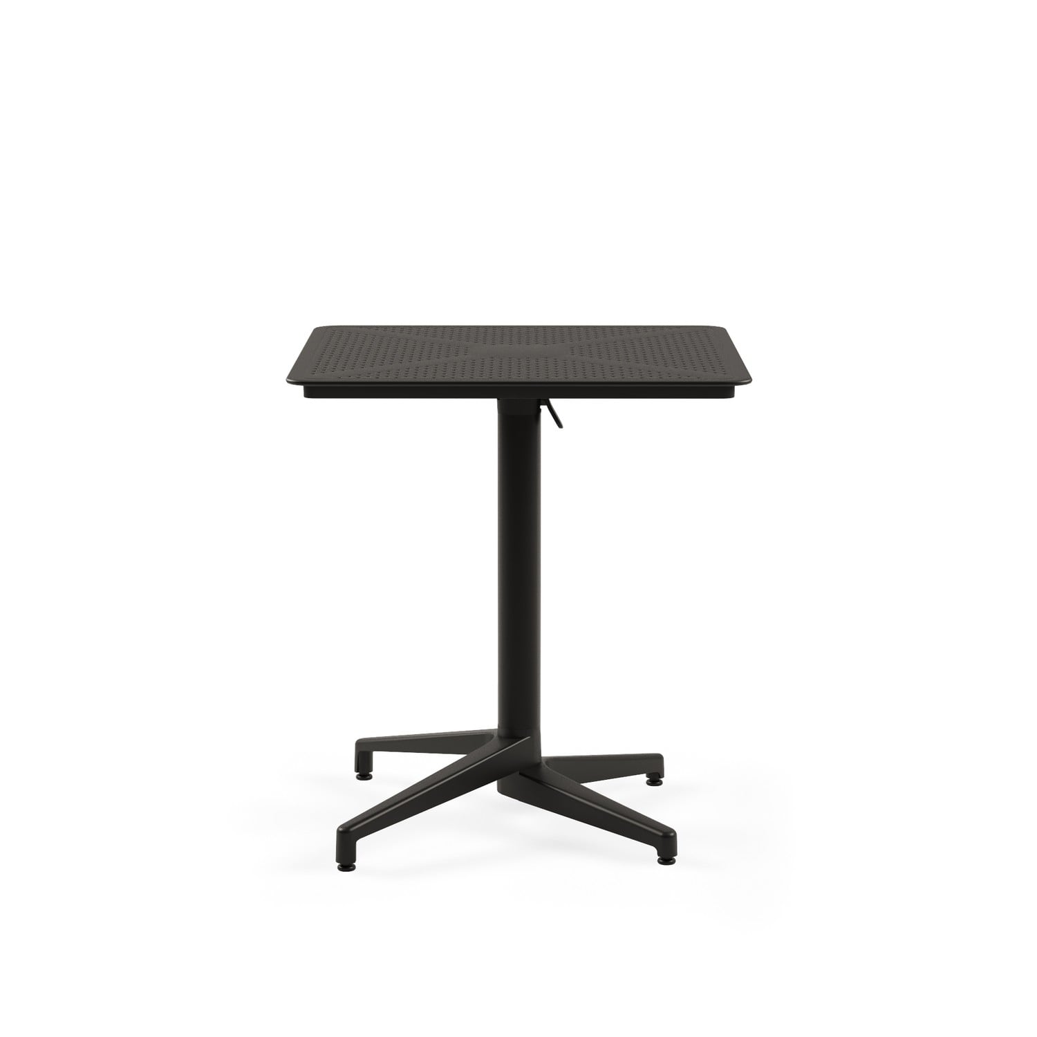 Piciorul mesei este realizat din aluminiu extrudat, ceea ce o recomanda a fi utilizata la exterior. Blatul este realizat din plastic si are forma patrata, cu dimensiunea de 70 x 70 cm.