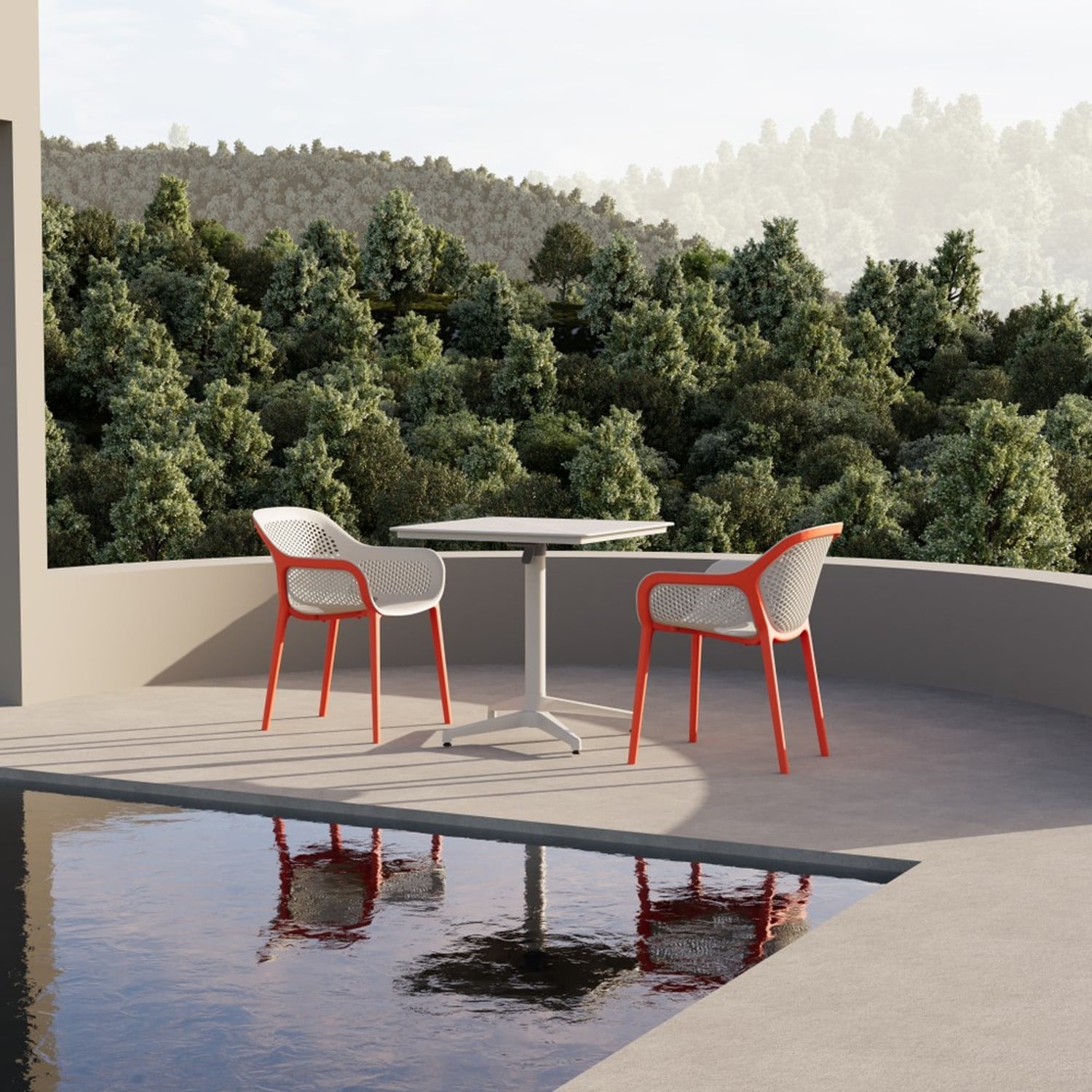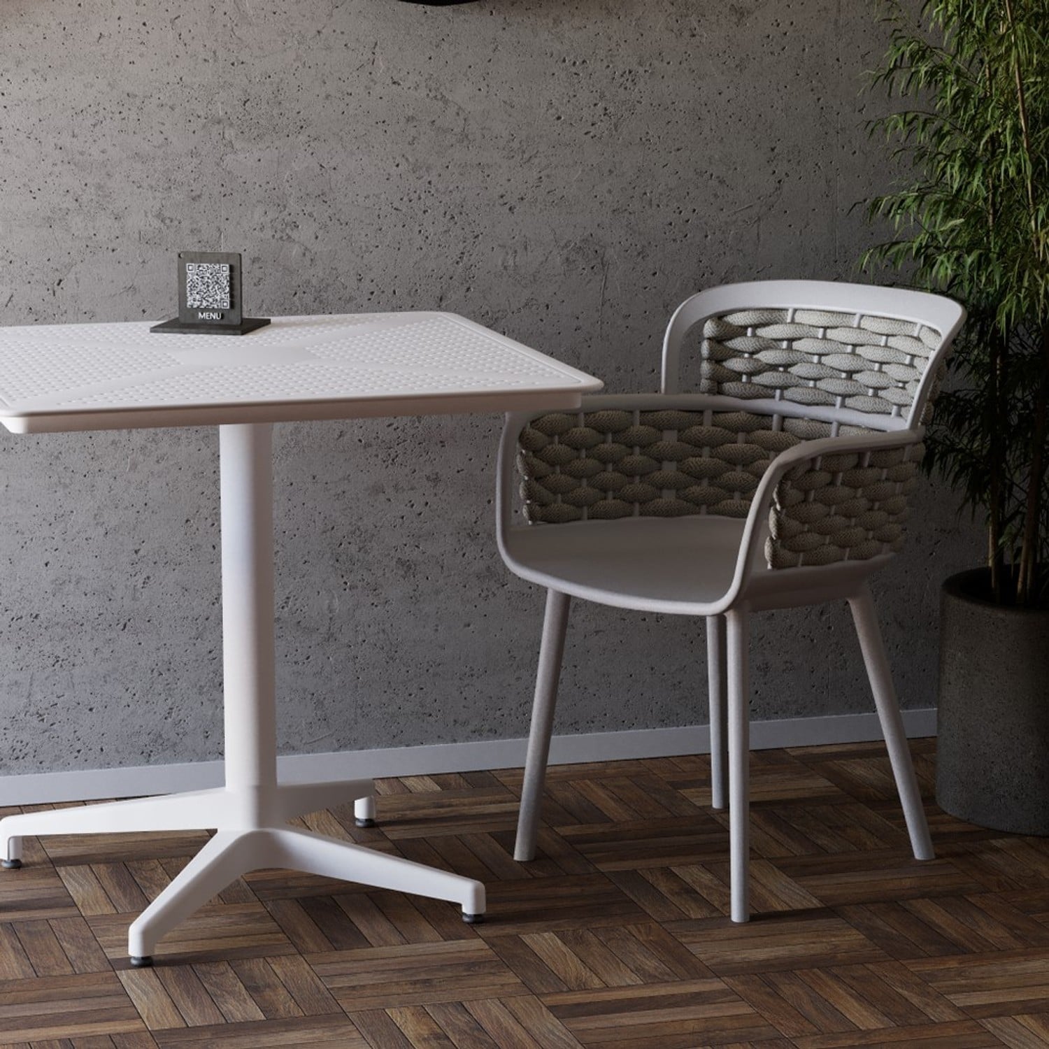 Masa pentru terasa cu blat patrat rabatabil MOON, este o masa cu o silueta eleganta si un design minimalist. Blatul este realizat din plastic si prezinta performarii si face ca praful sa nu se depuna cu usurina.