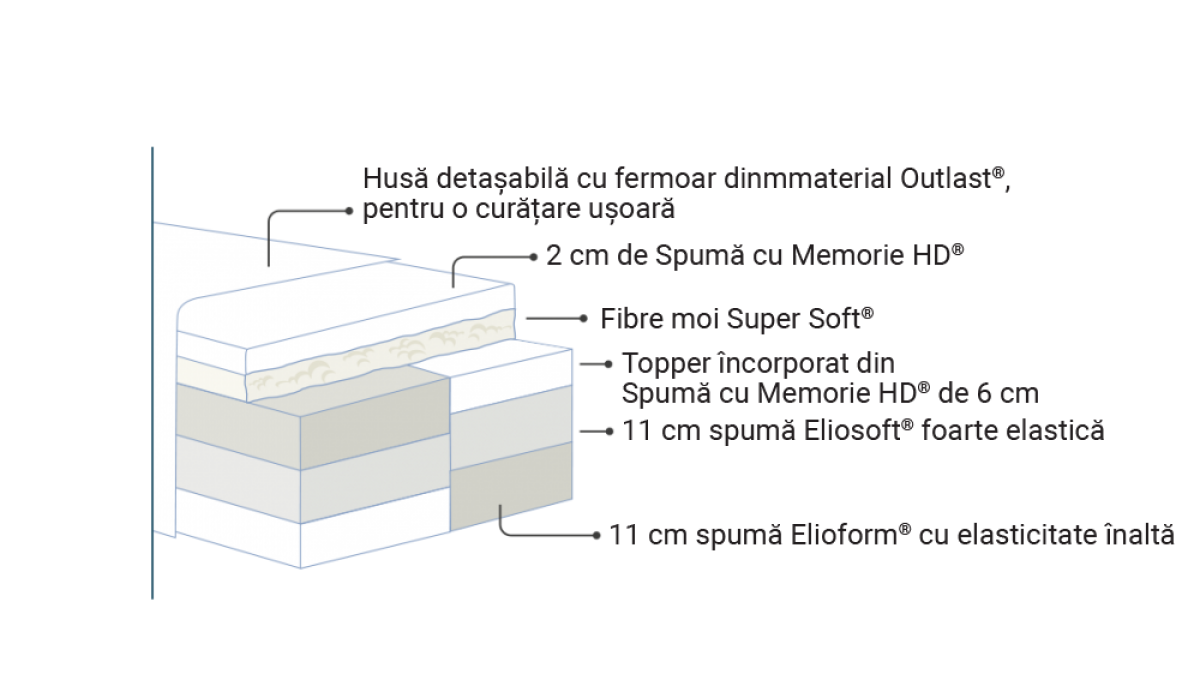 Armonia Dual are în componență spumă cu memorie în materialul textil în strat de 2 cm și un topper încorporat de 6 cm din spumă cu memorie.