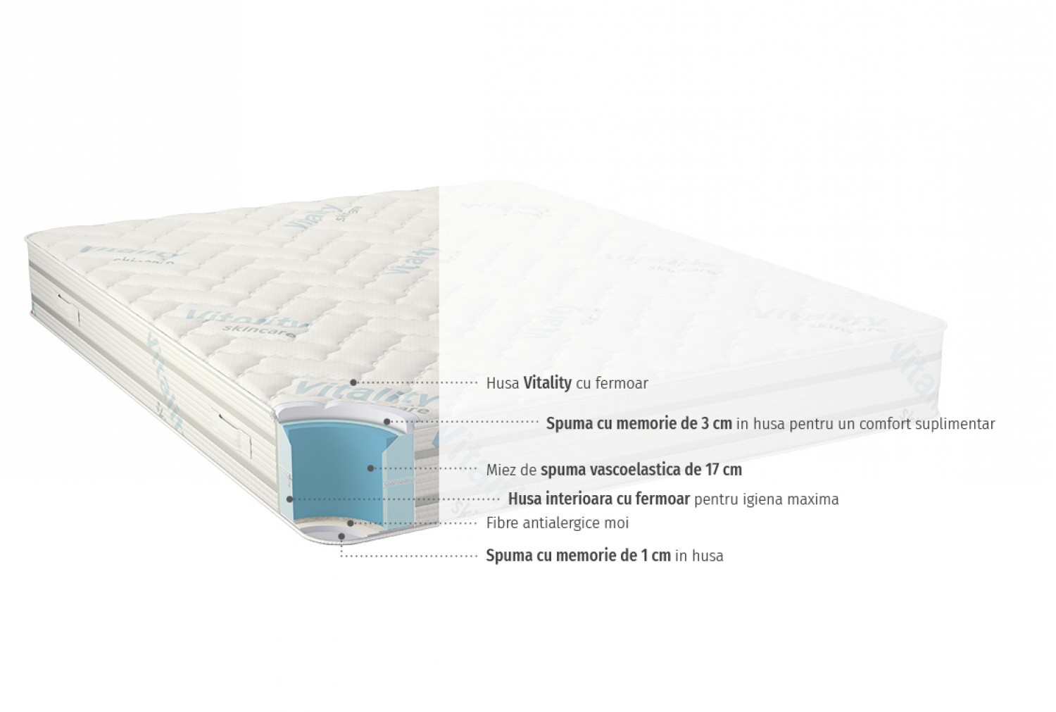 VitalCare este o saltea cu fermitate moale spre medie și are două fețe. Pe o parte există un strat de 3 cm de spumă cu memorie, care distribuie uniform greutatea corporală și reduce întoarcerile din timpul somnului. Acest lucru vă oferă un plus de confort și șansa de a vă bucura de un somn relaxat. Pe cealaltă parte a saltelei există un strat de 1 cm de spumă cu memorie, ce oferă un suport mai tare, astfel încât să puteți alege nivelul dorit de fermitate. Țesăturile au țesute fibre moi tratate împotriva acarienilor și bacteriilor. Partea superioară a husei saltelei poate fi detașată complet și utilizată ca o saltea portabilă din spumă cu memorie 100% tip topper.