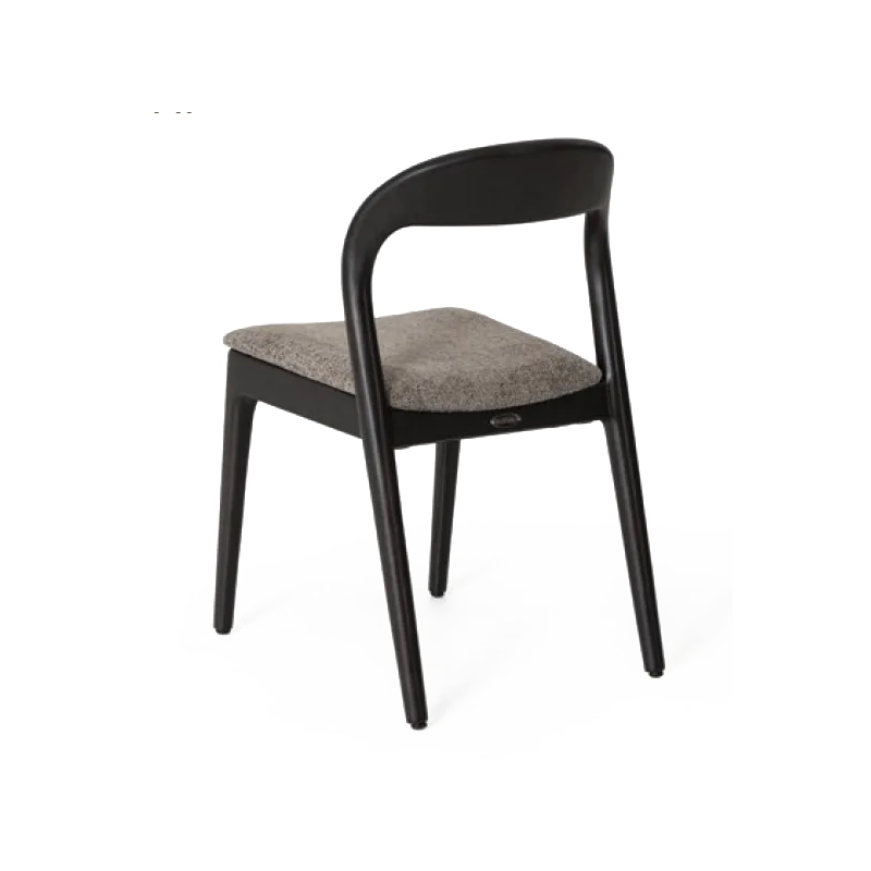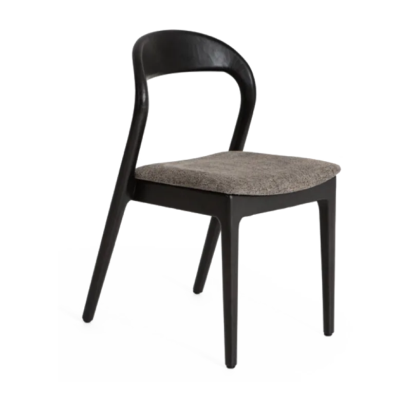 Structura solidă din lemn masiv este completată de un șezut tapițat într-o textură elegantă, care adaugă confort și o notă de rafinament discret. Liniile curbate ale spătarului oferă ergonomie naturală, adaptându-se cu ușurință atât pentru utilizare îndelungată, cât și pentru spații cu trafic intens.