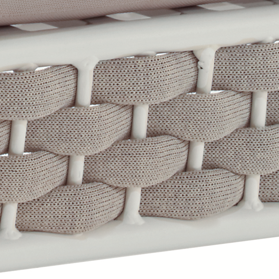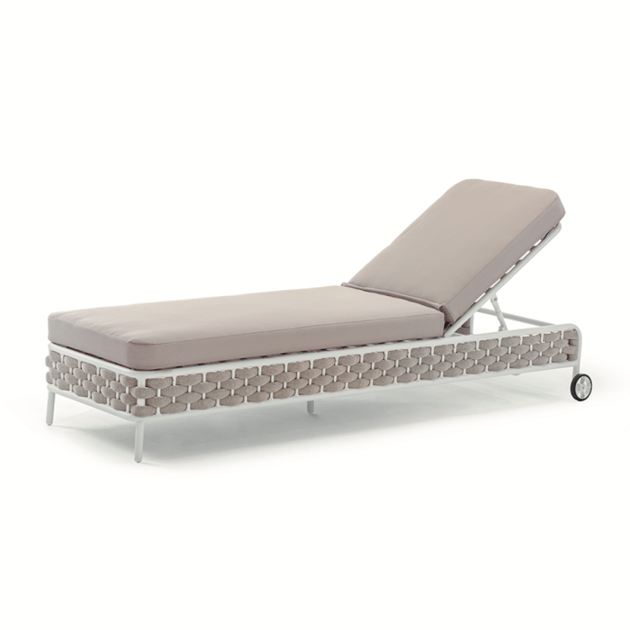 Este un sezlong din gama premium, ce se distinge prin cadrul robust din aluminiu acoperit decorativ cu corzi din poliester. Confortul superior este asigurat de pernele realizate din tesatura Olefin si umplutura din spuma cu uscare rapida (quick dry foam), materiale special concepute pentru a rezista mediului exterior si umiditatii. Designul elegant si proprietatile hidrofuge il recomanda pentru amenajarile exclusiviste de tip HoReCa, piscine si terase moderne.